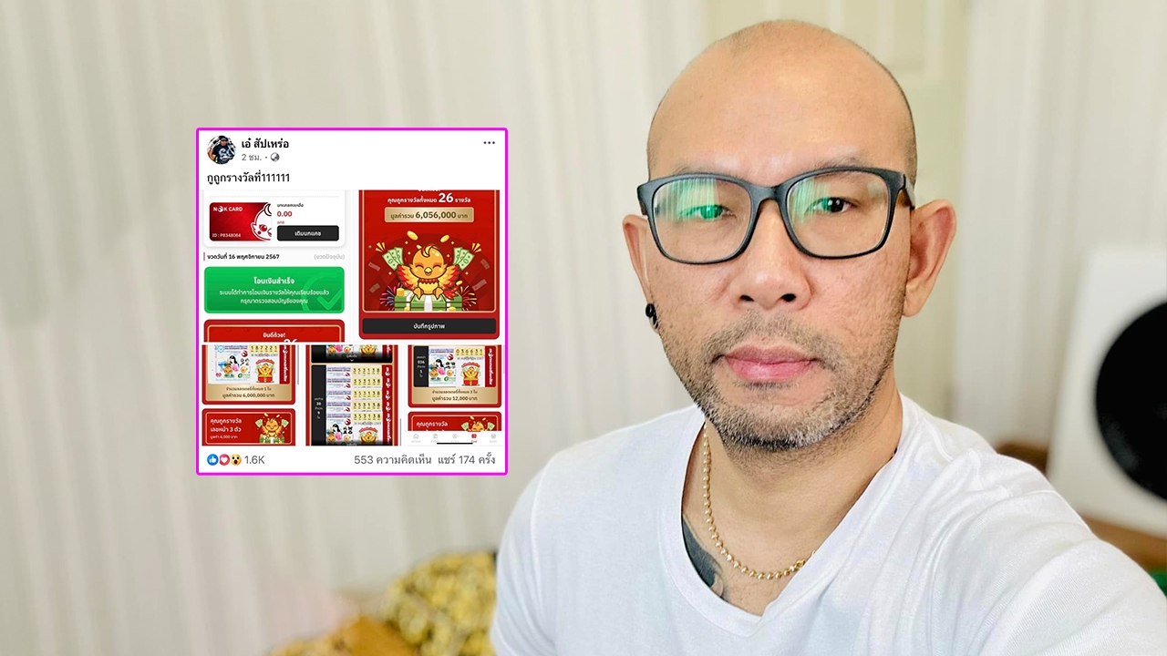 โดย เอ๋ เชิญยิ้ม โพสต์ภาพในเฟซบุ๊ก เอ๋ สัปเหร่อ ซึ่งมีภาพลอตเตอรี่ถูกรางวัลที่ 1 งวดประจำวันที่ 16 พ.ย. 2567 คือหมายเลข 187221 จำนวน 1 ใบ, รางวัลเลขหน้า 3 ตัว 923, 036 จำนวน 3 ใบ, รางวัลเลขท้าย 2 ตัว 38 จำนวน 22 ใบ รวมทั้งหมด 26 ใบ เป็นเงินรางวัลทั้งสิ้นกว่า 6,056,000 บาท พร้อมทั้งเขียนแคปชั่น “กูถูกรางวัลที่ 111111”